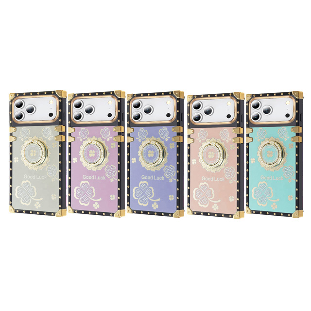 Square Rectangular Case with Clover Design Ring Stand Hook for iPhone 17 Pro Max